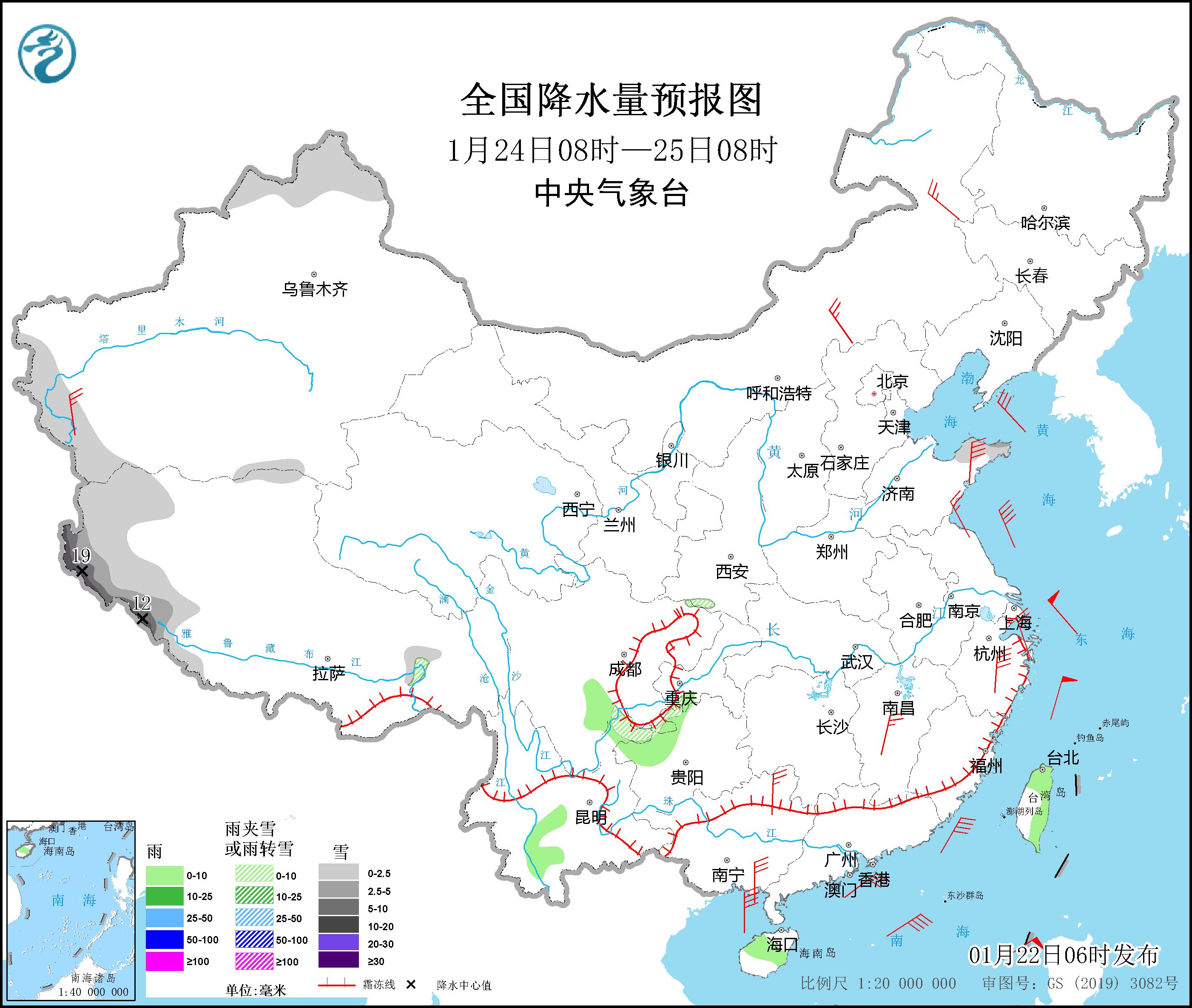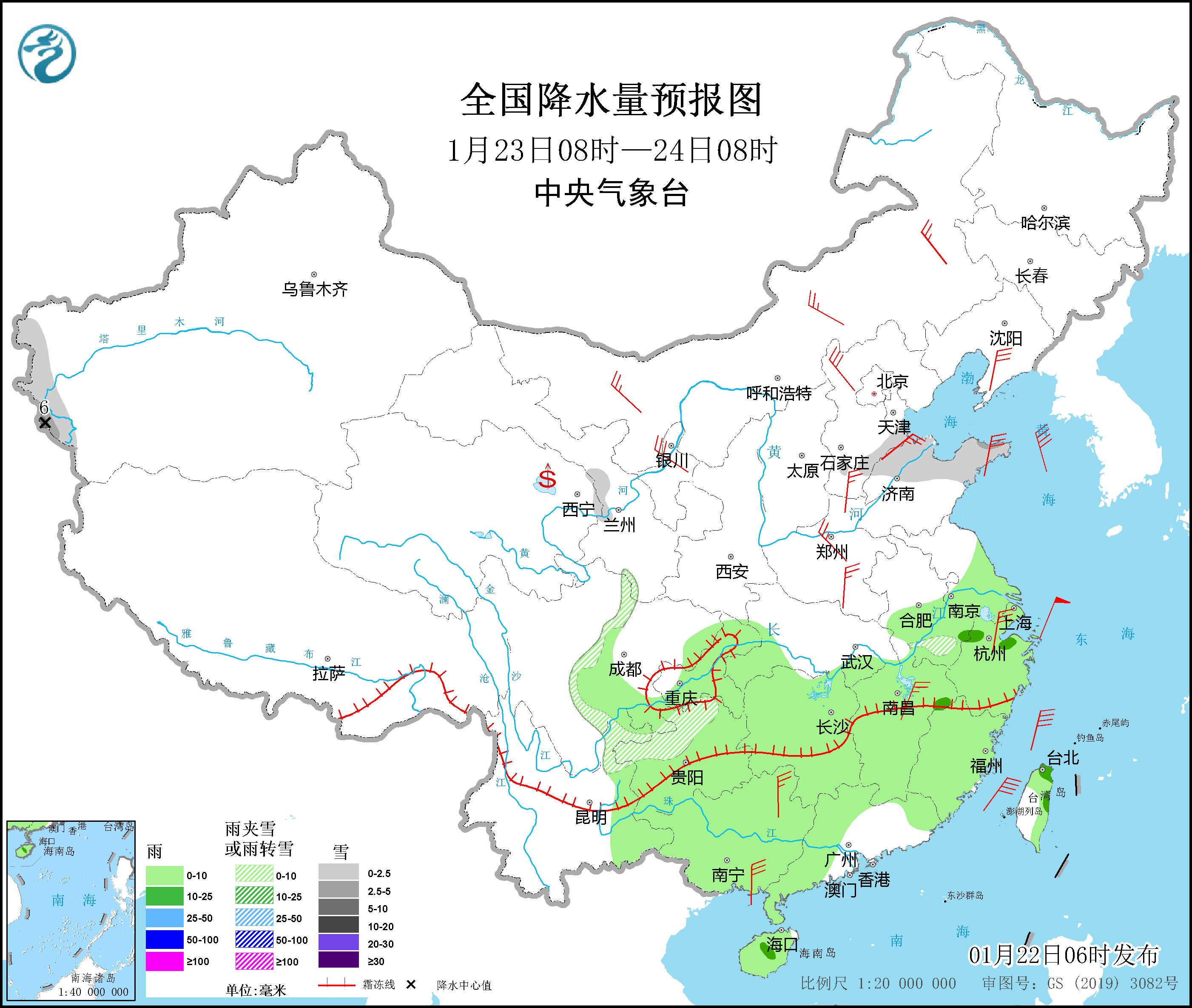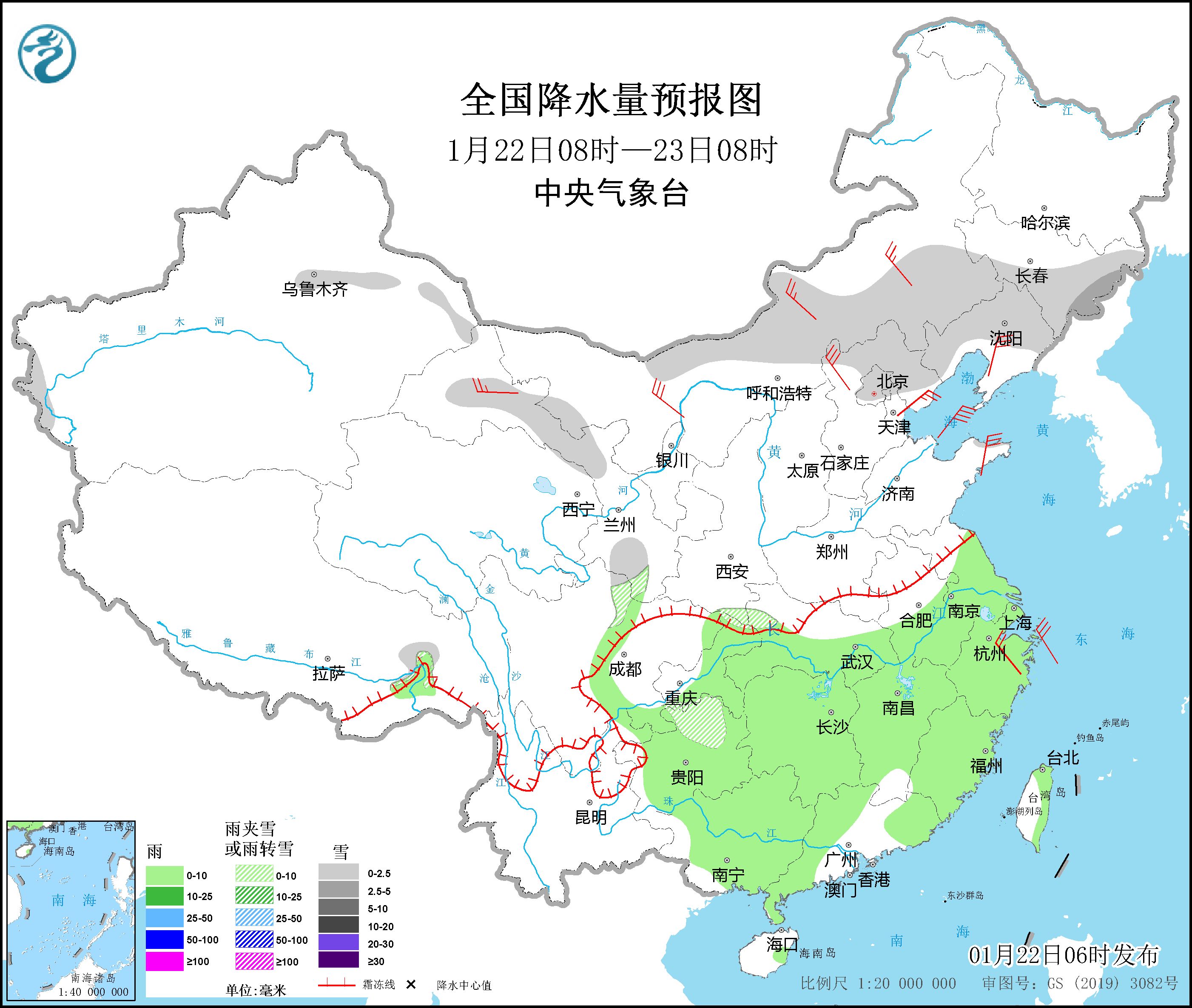 1月22日08時至23日08時,華北中北部、東北地區中南部、甘肅西部和南部等地部分地區有小到中雪或雨夾雪。江淮東部和南部、江漢南部、西南地區東部、江南、華南大部等地部分地區有小雨。內蒙古中西部、遼東半島、甘肅河西、山東半島、浙江北部等地部分地區有4~6級風。渤海、渤海海峽有6~8級、陣風9~10級的北到東北風。