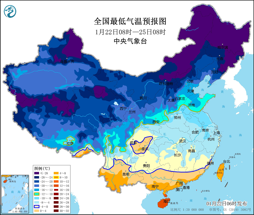 全國最低氣溫預報圖(1月22日08時-25日08時)