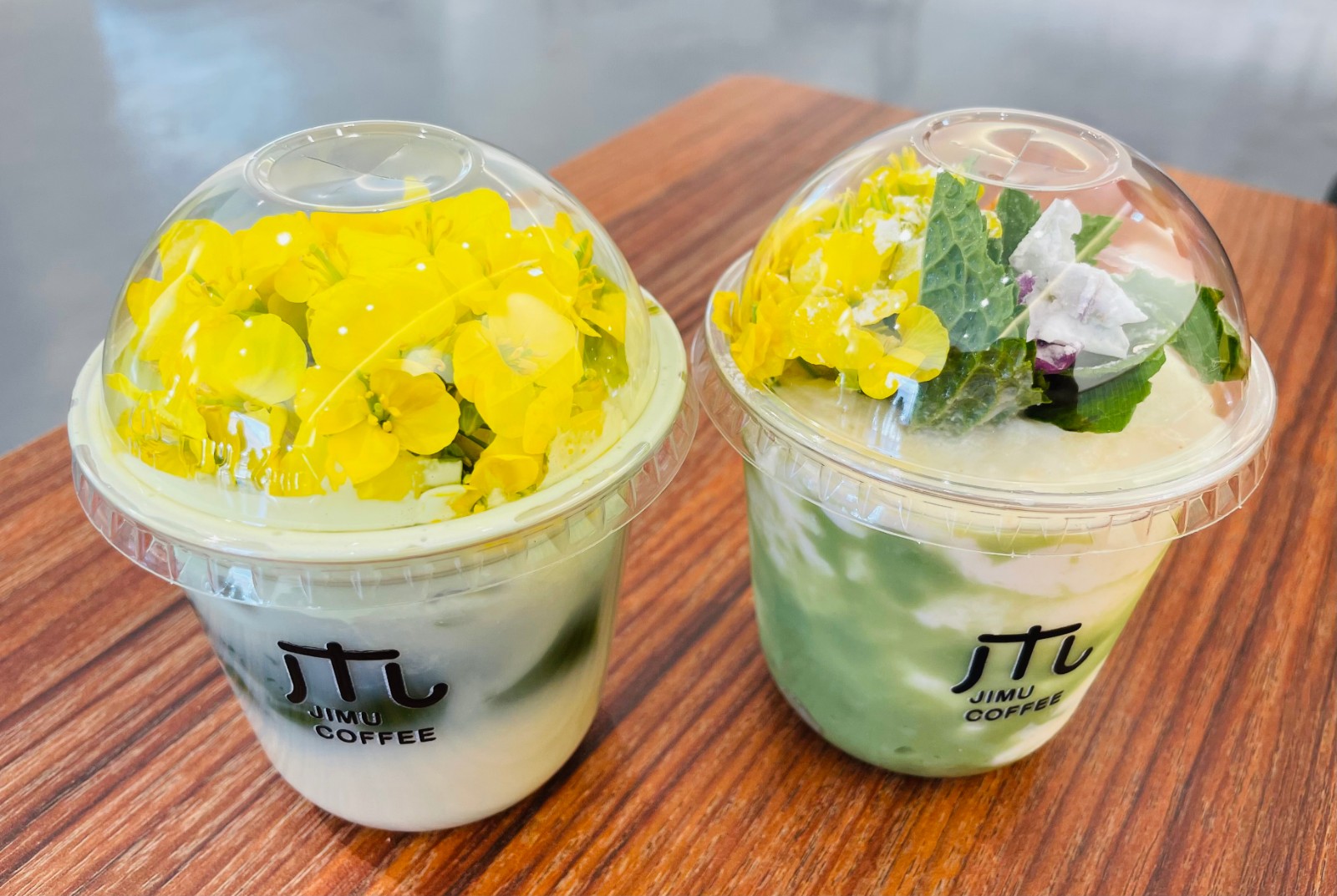 剛剛開業的JIMU咖啡店,將垛田菜花和青綠田野融入特調飲品,吸引遊客紛紛落單。(記者宋璟 攝)