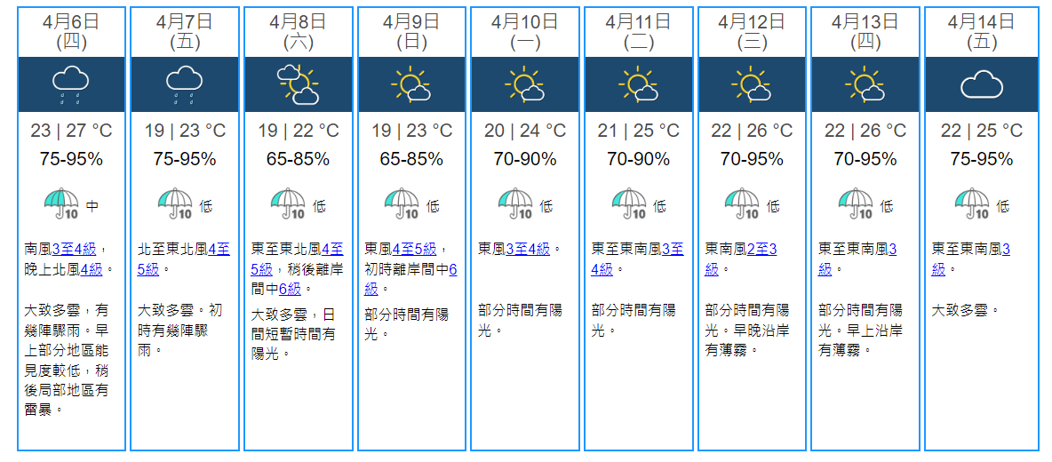 根據九天天氣預報,明後兩日有驟雨,局部地區有雷暴;後日氣溫下降至19至22度;周六(8日)大致多雲,日間短暫時間有陽光,氣溫攝氏19至22度;下周日至周四部分時間有陽光,氣溫漸上升。