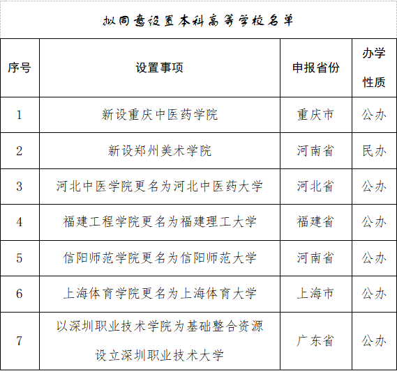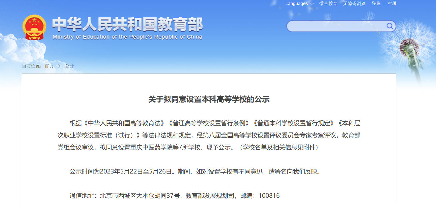 5月22日,教育部官網發布《關於擬同意設置本科高等學校的公示》,根據《中華人民共和國高等教育法》《普通高等學校設置暫行條例》《普通本科學校設置暫行規定》《本科層次職業學校設置標準(試行)》等法律法規和規定,經第八屆全國高等學校設置評議委員會專家考察評議,教育部黨組會議審議,擬同意設置重慶中醫藥學院等7所學校,現予公示。公示時間為2023年5月22日至5月26日。