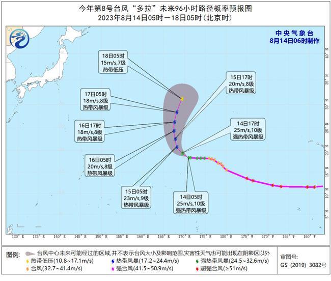 今年第8號颱風「多拉」(DORA)(強熱帶風暴級)的中心早晨5點鐘位於美國關島偏東方向約2840公里的西北太平洋洋面上,就是北緯18.3度、東經170.9度,中心附近最大風力有10級(25米/秒),中心最低氣壓為985百帕,七級風圈半徑130-180公里,十級風圈半徑70-120公里。