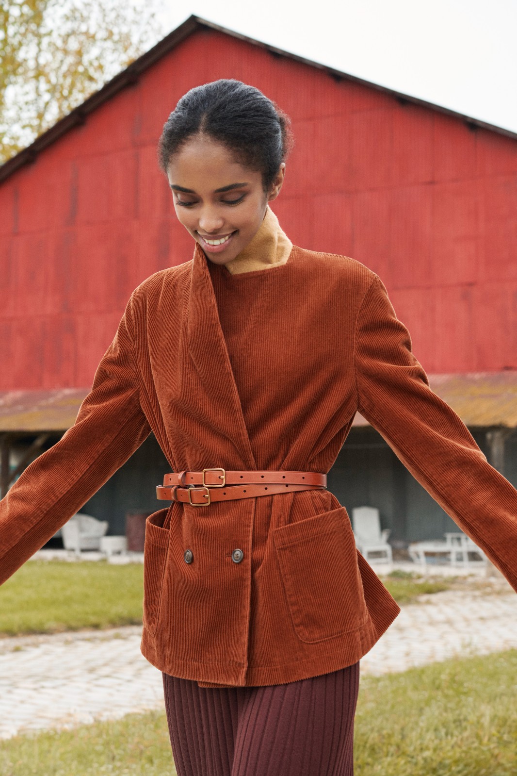 IDLF燈芯絨雙排釦外套,HK$599。IDLF皮帶,HK$199。正統款式外套由於採用寬版設計及柔軟加工的棉質燈芯絨物料,可穿出休閒感。背部及袖的內裏採用原創格紋花色設計,可捲袖口。