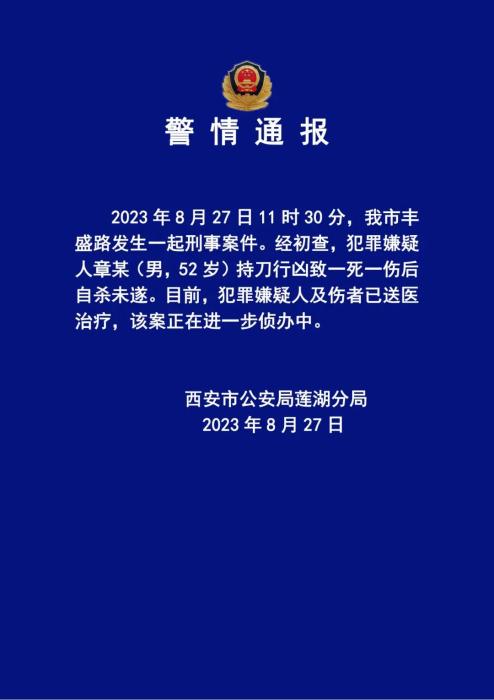 27日,西安市公安局蓮湖分局在官方微信公眾號發布警情通報稱,8月27日11時30分,西安市豐盛路發生一起刑事案件。經初查,犯罪嫌疑人章某(男,52歲)持刀行兇致一死一傷後自殺未遂。