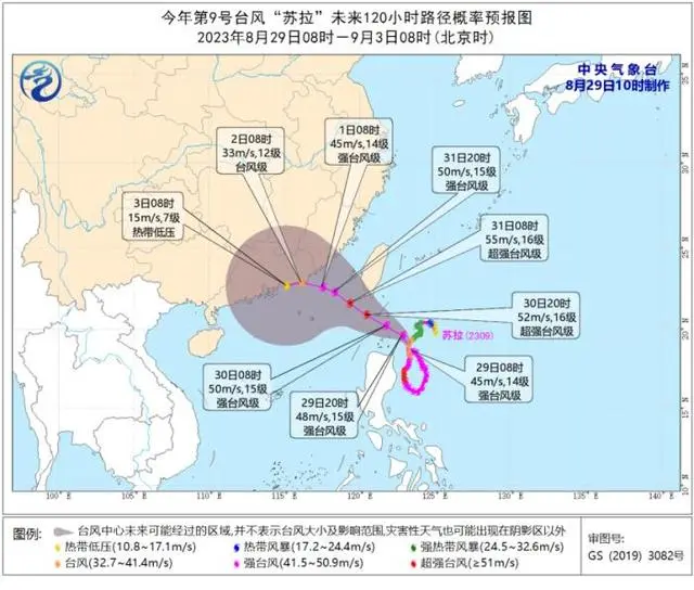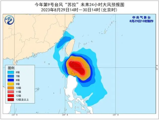 另據中央氣象台網站消息,中央氣象台8月29日10時發布颱風藍色預警:今年第9號颱風「蘇拉」(SAOLA)(強颱風級)的中心今日(29日)上午8時位於台灣鵝鑾鼻東南方向大約460公里的海面上,就是北緯18.6度、東經123.5度,中心附近最大風力有14級(45米/秒),中心最低氣壓為950百帕,七級風圈半徑220-250公里,十級風圈半徑80-90公里,十二級風圈半徑50公里。