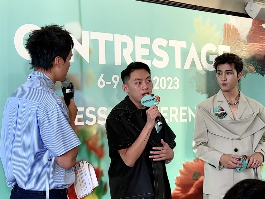 藝人Phoebus(吳啟洋)(右)及Brian(陳安立)(左)穿上由香港設計師Wilson Choi(蔡鴻成) (中)打造的REDEMPTIVE服裝出席CENTRESTAGE新聞發布會。
