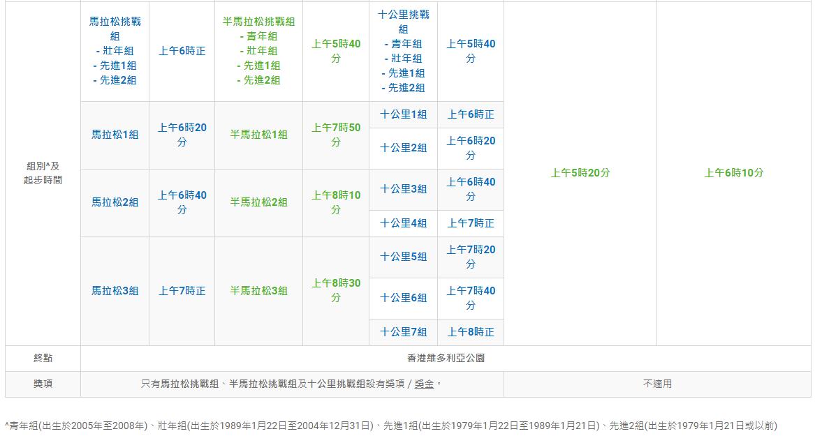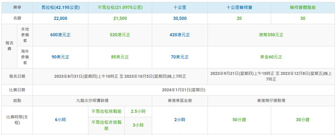 今屆賽事共設馬拉松、半馬拉松、10公里賽、10公里輪椅賽及輪椅賽體驗組(2.5公里)5個項目。全馬、半馬及10公里賽事將從8月31日上午10時開始報名,10月5日晚上7時截止;10公里輪椅賽及輪椅賽體驗組將從9月21日上午10時起報名,12月8日晚上7時截止;而公眾抽籤報名(包括重推的10公里隊制賽)將於9月21日上午10時正式開始。全馬及半馬的比賽起點為尖沙咀彌敦道,10公里賽事的起點是東區走廊,10公里輪椅賽及輪椅賽的起點是灣仔運動場。