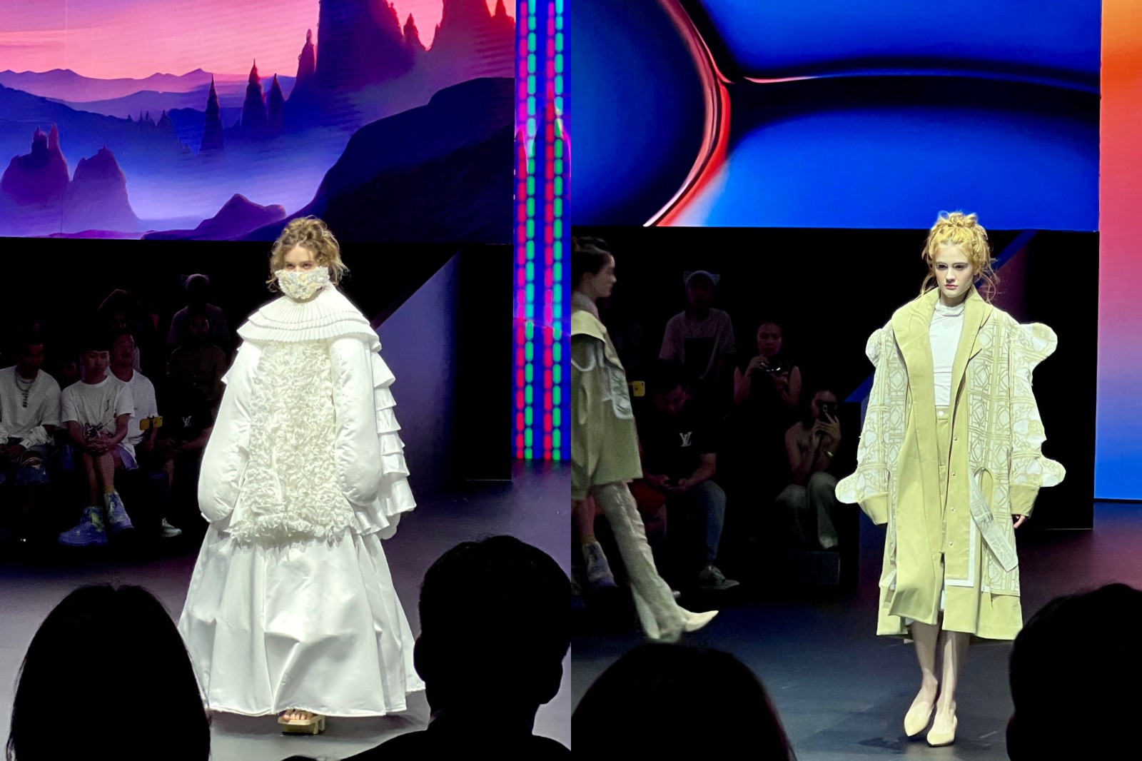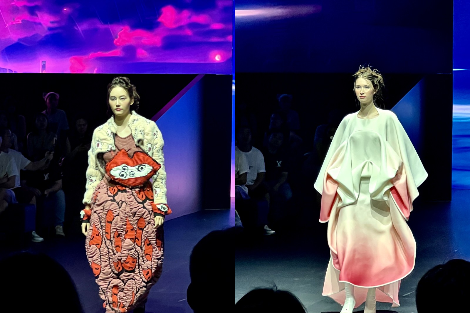 香港知專設計學院(左)、香港理工大學時裝及紡織學院時裝作品(右)。