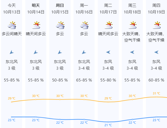 ▪ 今日(13日)多雲間晴天;氣溫23-29℃;東北風3級;相對濕度55%-85%。