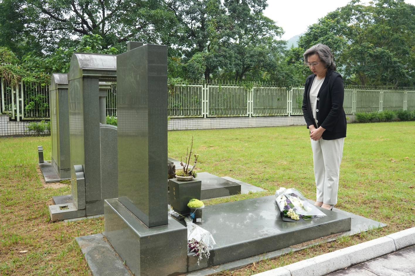 楊何蓓茵表示,長埋浩園的76位殉職公務員,來自政府不同部門和職級,他們克盡己任為市民服務,執行職務時的無私奉獻和付出,永遠是值得學習的楷模。她亦到景仰園向菲律賓馬尼拉人質事件的死難者獻花致意。(圖源:楊何蓓茵fb)
