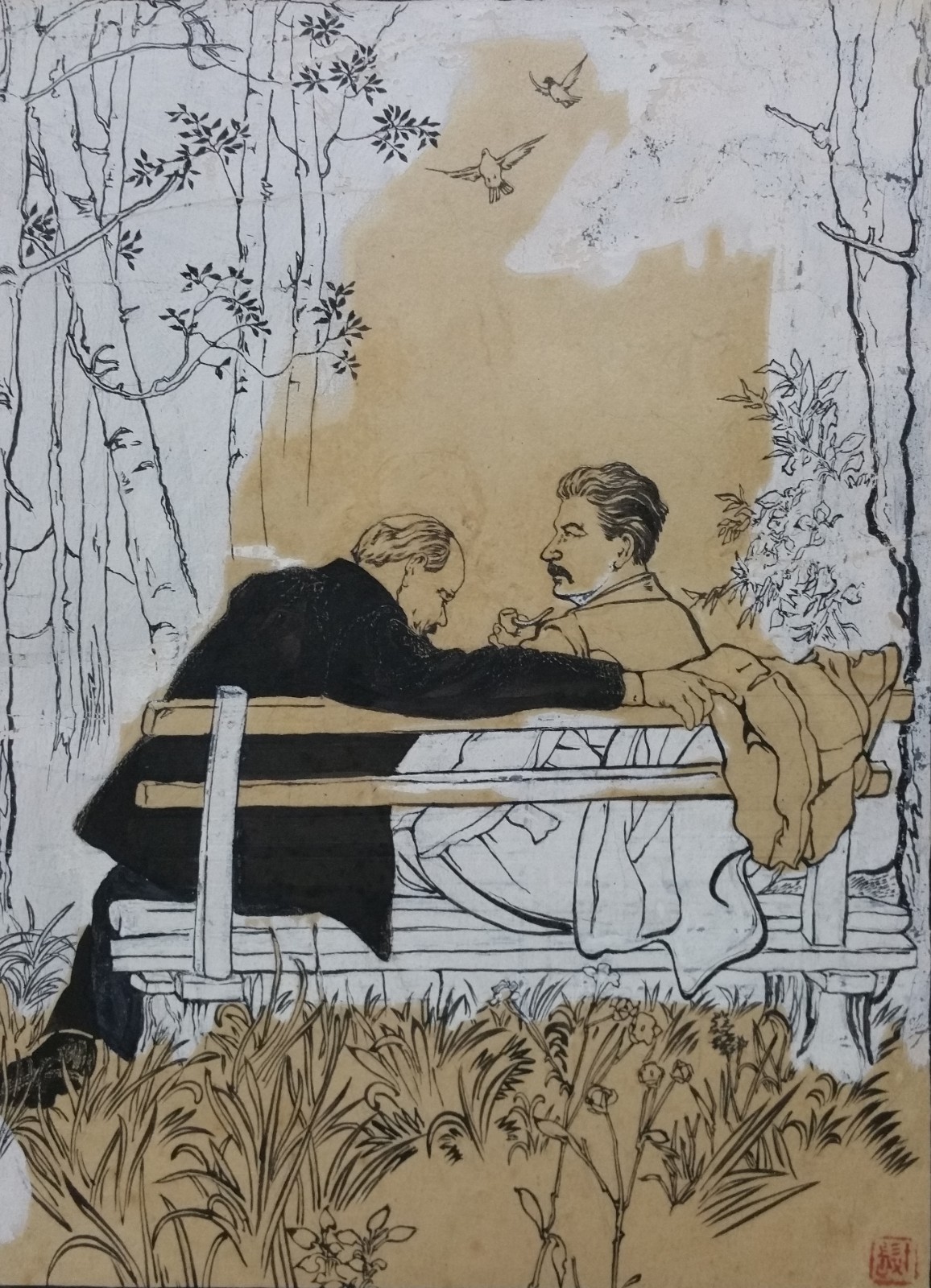 程十髮作品《列寧和斯大林在一起》,26.3x19cm。
