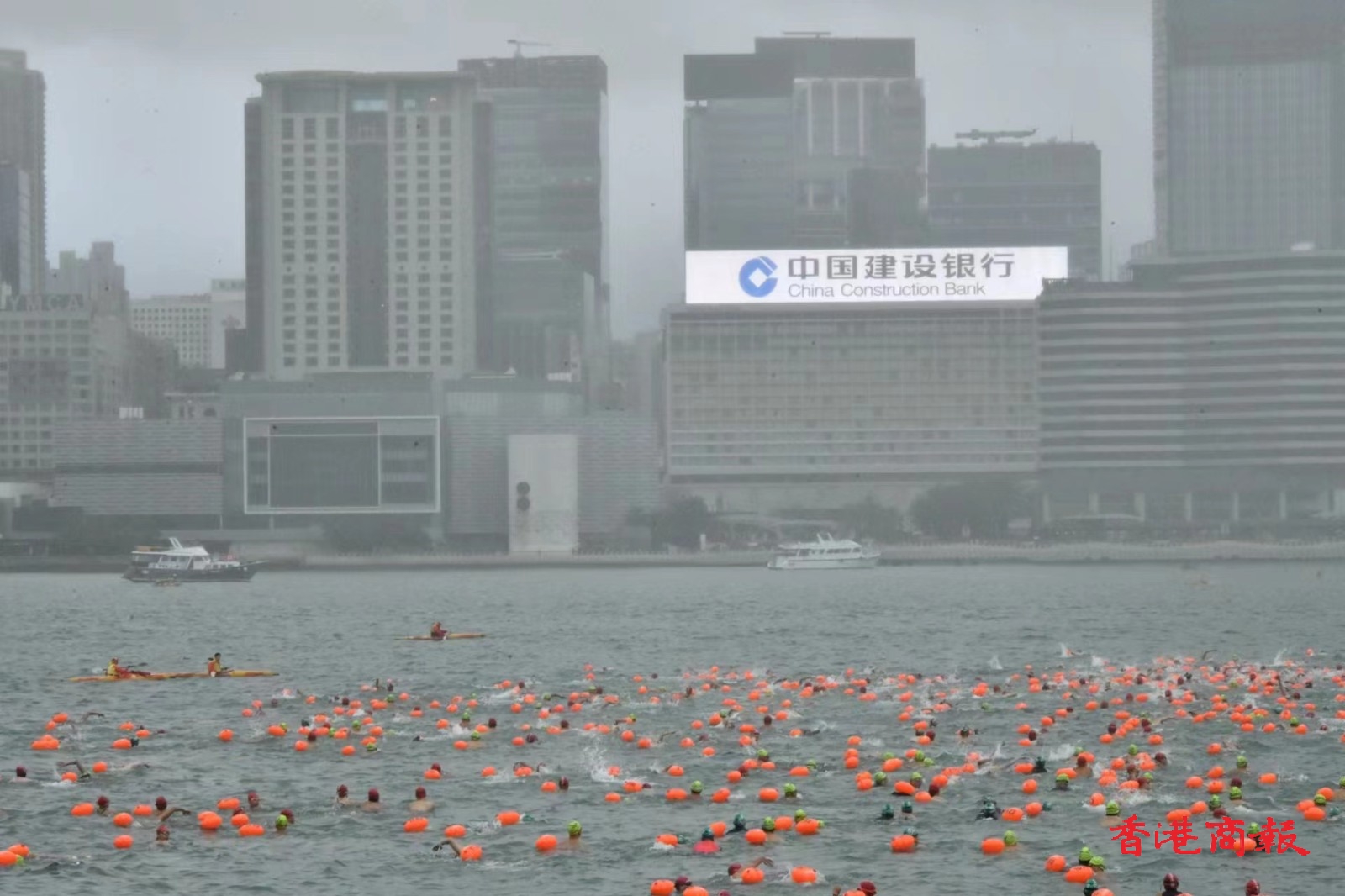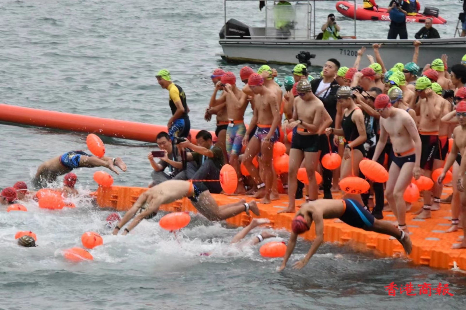 「新世界維港泳」今日(12日)早上於維多利亞港揭幕,4000名泳手由灣仔金紫荊廣場公眾碼頭出發,游至終點尖沙咀星光大道,競逐賽事各項殊榮。香港特別行政區政務司司長陳國基主持起步禮。(蔡啟文攝)