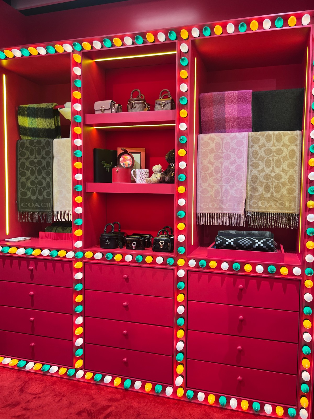 限定店設計採用千枚紅、綠、黃、白四色LED燈泡打造,以霓虹光影點亮節日溫暖氣氛。全店以聖誕紅為主色調,配合四色LED燈展示台及展架,一眼望見最新系列、經典Tabby展台及精品配飾展櫃,陳列方式簡潔利落。