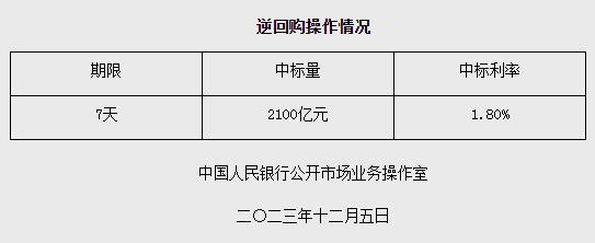據央行網站消息,為維護銀行體系流動性合理充裕,2023年12月5日人民銀行以利率招標方式開展了2100億元逆回購操作,中標利率1.80%,期限為7天。具體情況如下: