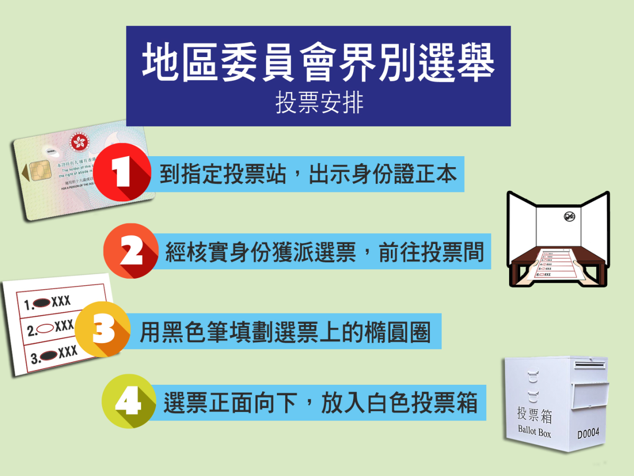 至於地區委員會界別,投票人需要在選票上,將想投選的候選人姓名左邊的橢圓圈填滿,所選的候選人數目,要與該區的地區委員會界別議席相同。填好後,不要摺疊選票,把已填劃的一面向下以遮蓋選票上的選擇,然後放入白色投票箱內。又或將選票摺疊,令已填劃的一面向內以遮蓋選票上的選擇,之後放入白色投票箱內亦可。