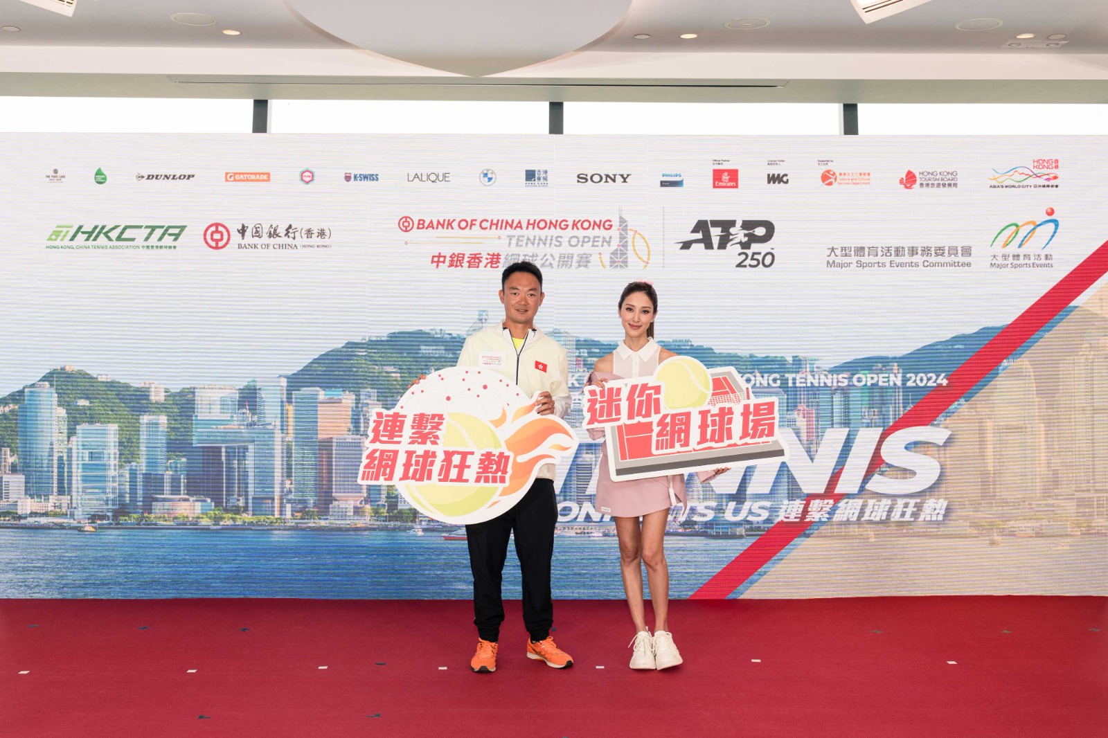 前中國香港網球代表、曾排名第一的余曉東(左)和著名藝人陳凱琳(右)今日出席新聞發布會,與大會一同公布賽事「網球同樂區」一系列適合一家大小免費參與的娛樂活動。