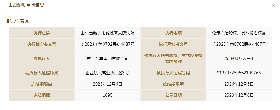 近日,雷丁汽車集團有限公司新增股權凍結信息,凍結股權數額為25.88億元。