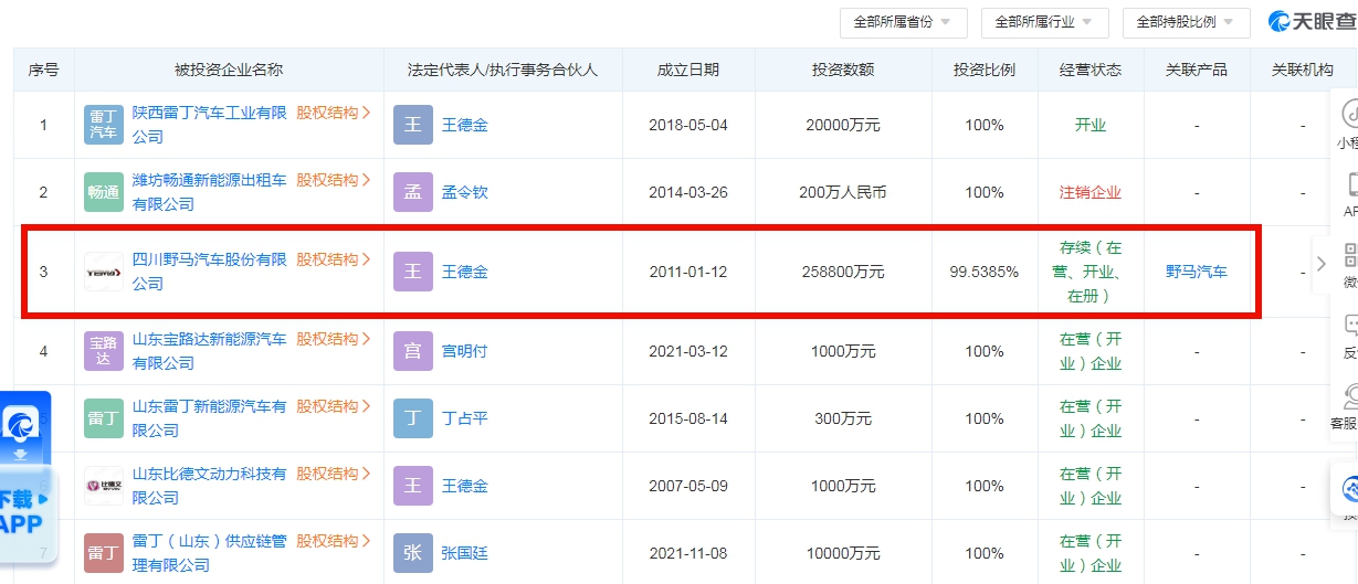 對外投資信息顯示,雷丁汽車持有四川野馬汽車股份有限公司約99.54%的股份,投資數額為25.88億元。