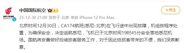 據中國國際航空微博消息,北京時間12月30日,CA174航班(悉尼-北京)在飛行途中出現故障,機組按程序處置,為確保安全,決定返航悉尼,飛機已於北京時間19時45分安全落地悉尼機場。國航將妥善做好後續旅客服務工作,對於因此給旅客帶來的不便,我們深表歉意。