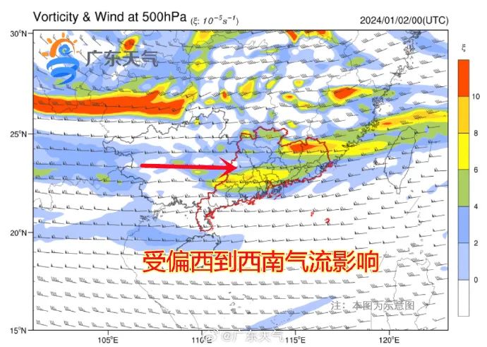據@廣東天氣消息,未來5天,副高位於南海中部偏北,廣東省主要受偏西到西南氣流影響,間中有短波槽影響,西北部有弱降水,其餘大部多雲為主;2-3日早晨,西江流域和粵西的部分市縣有(輕)霧,粵北部分市縣受弱降水影響,以上地區能見度偏低。