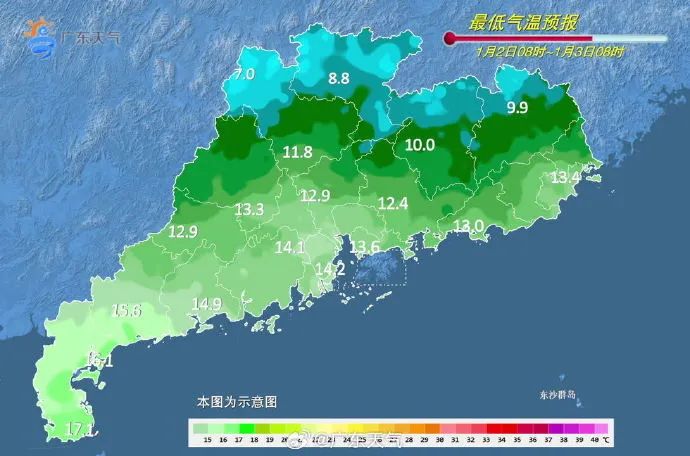 2日,粵北和珠三角北部多雲到陰天,有分散小雨,其餘地區多雲。早晨最低氣溫:粵北、粵東的北部山區市縣9℃~11℃,粵西市縣15℃~18℃,其餘市縣12℃~15℃。