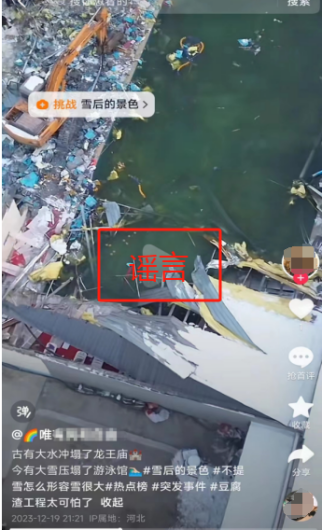 12月21日,競秀網警工作中發現,抖音用戶「唯某某」,在抖音發布了一條視頻稱:「古有大水沖了龍王廟,今有大雪壓塌了游泳館,豆腐渣工程太可怕了。」該視頻信息被多次轉發,引發熱議。競秀公安分局對此非常重視,立即進行展開核查。經核實,該游泳池為正常工程改造,並非被雪壓塌。此網絡短視頻明顯系蹭熱點編造謠言。