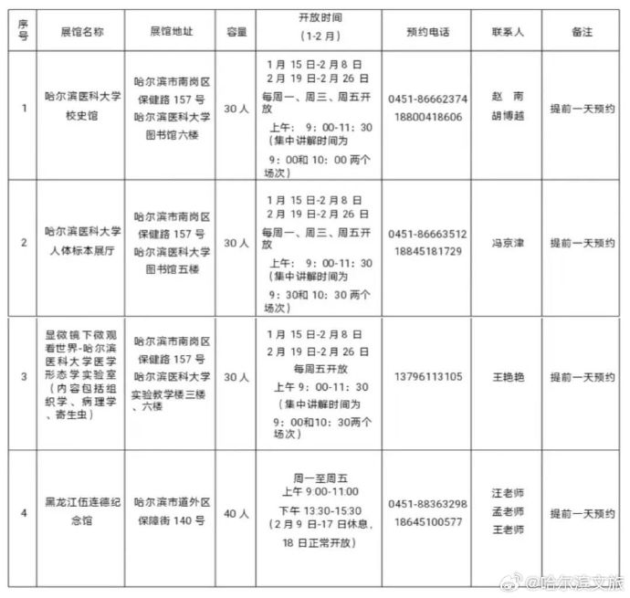 除了哈藥六廠,2024年1月15日至2024年2月26日,哈爾濱醫科大學亦對外開放,遊客們可以打卡校史館、人體標本展廳、形態學實驗室和伍連德紀念館,具體開放情況見下表。