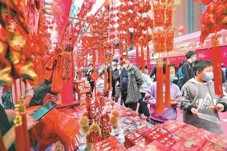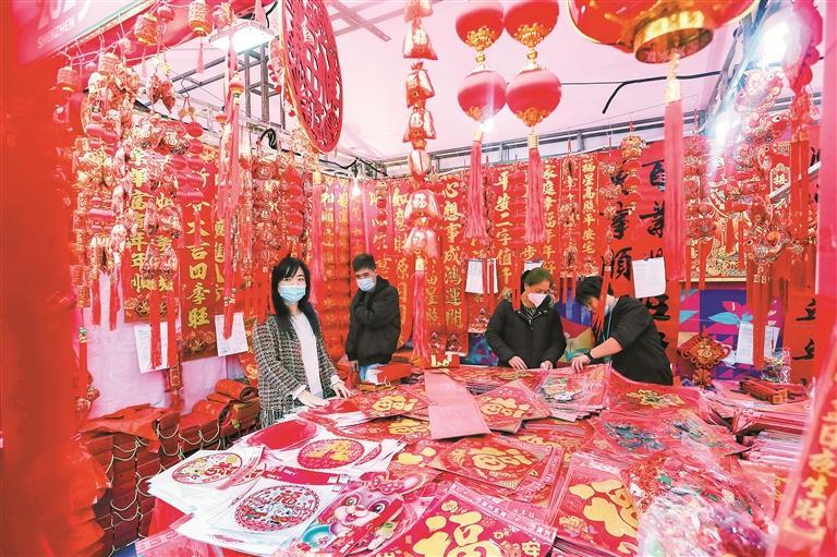 以「花」為媒,鹽田區迎春花市設置新消費場景,不僅年味滿滿,也進一步增氣氛、促消費。在鹽田花市,不但可以買到鮮花、年桔等花卉產品,還可以買到利是封、春聯、各類糖果零食等年貨。