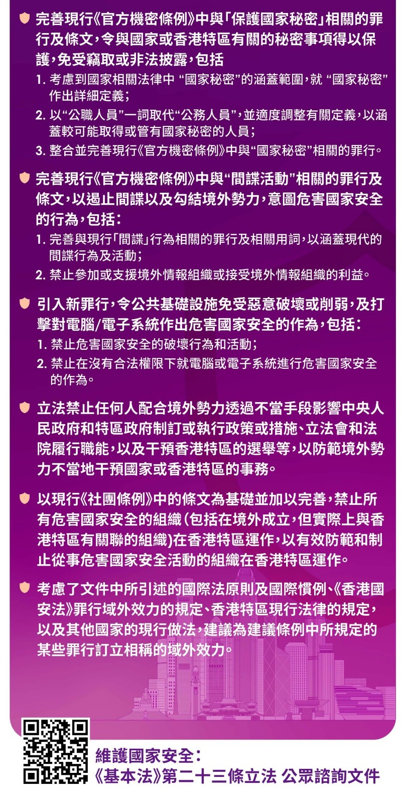 民建聯續指,制定和根據實際情況不斷完善維護國家安全的法律,是美西方和其他國家均採取的做法。香港社會經歷了2019年的黑暴,也看到《香港國安法》有效止暴制亂,恢復社會治安,讓香港重回正軌,廣大市民深刻了解到制訂一套整全的維護國家安全法律的重要性及迫切性。我們認為,落實《基本法》第23條,立法禁止相關危害國家安全的行為,能與《香港國安法》及其他本地法例共同構建更健全的維護國家安全法律制度和執行機制,有助全面準確貫徹「一國兩制」方針,維護國家安全,也從根本上保障了市民的安全、權利、自由和香港的長期繁榮穩定。