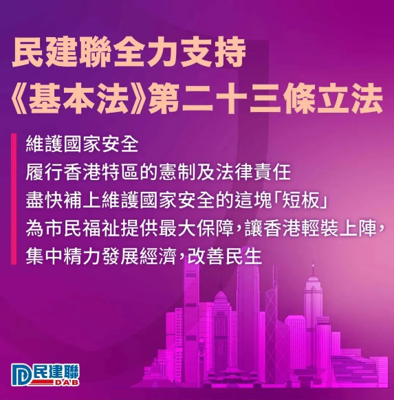 民建聯指,特區政府根據《基本法》第23條進行立法,是落實《基本法》賦予特區的憲制及法律責任、維護國家安全的必要工作。我們全力支持特區政府及早妥善完成有關工作,確保香港補齊國家安全的「短板」,更好地集中精力發展經濟、改善民生。