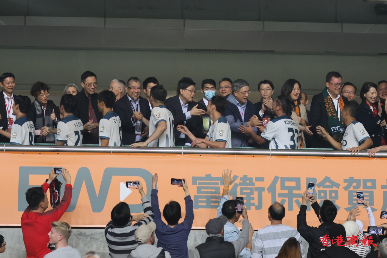 在賽後頒獎禮上,李家超笑容滿面,不時與球迷揮手示好,又同香港明星隊的山度士熱情握手,其後輪到世界明星隊球員逐一上台,特首更與英格蘭門將大衛占士來個擁抱,心情相當興奮,可說是盡慶而歸。(文、圖、影片:志誠)