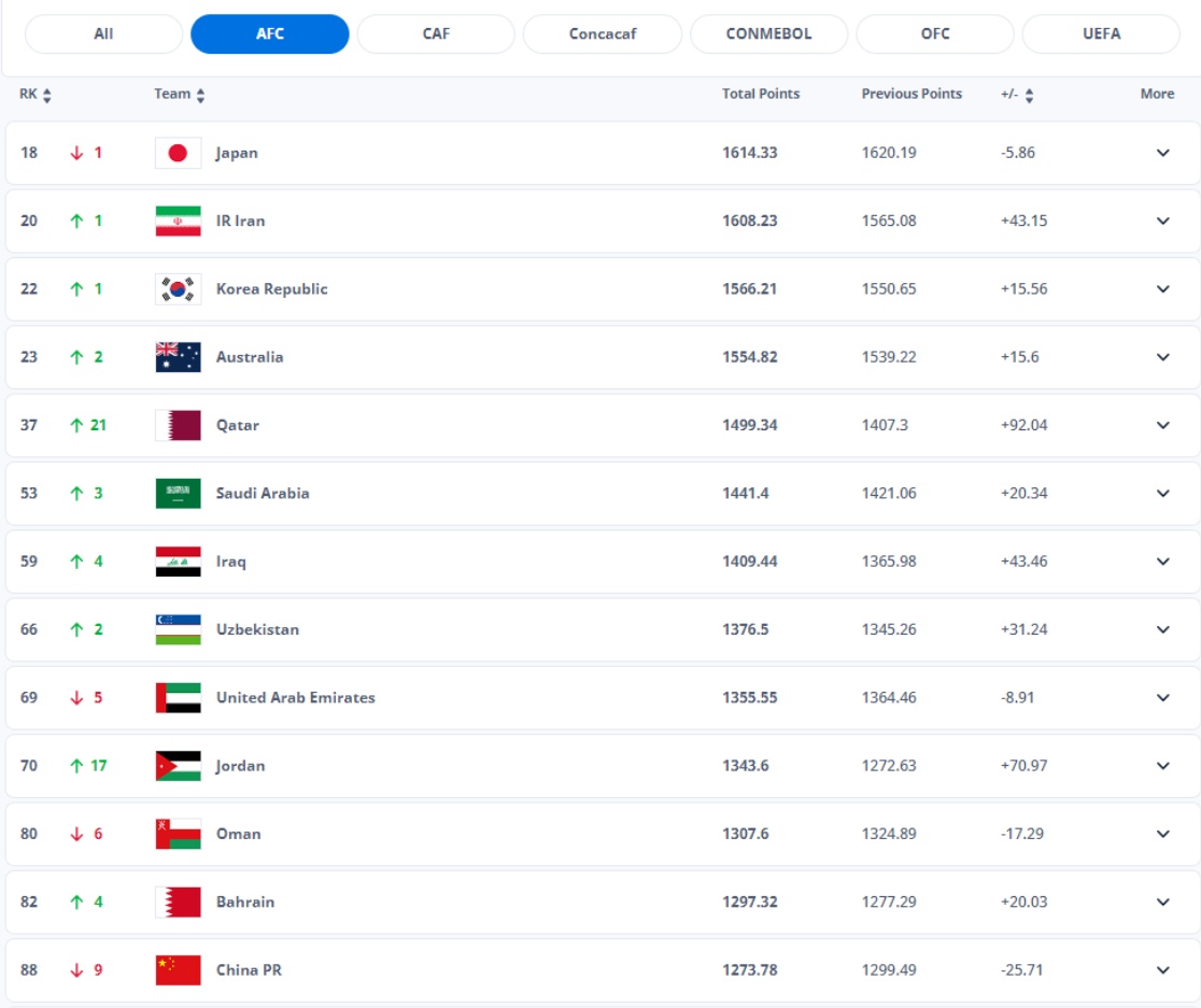 國際足聯上一次發布世界排名是在去年末,彼時中國隊位列第79,亞洲第11。過去這個記分周期中,中國隊的主要任務是備戰並參加卡塔爾亞洲盃。可無論熱身賽還是正賽,國足表現均不理想。