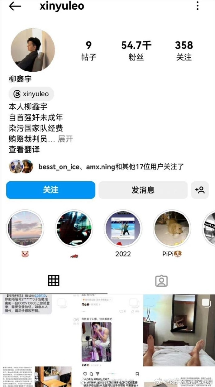 今日(20日),中國花樣滑冰冰上舞蹈運動員柳鑫宇的海外社交賬號疑似發布多條不雅內容,自稱有違法行為,引發網民熱議,亦登上微博熱搜首位。