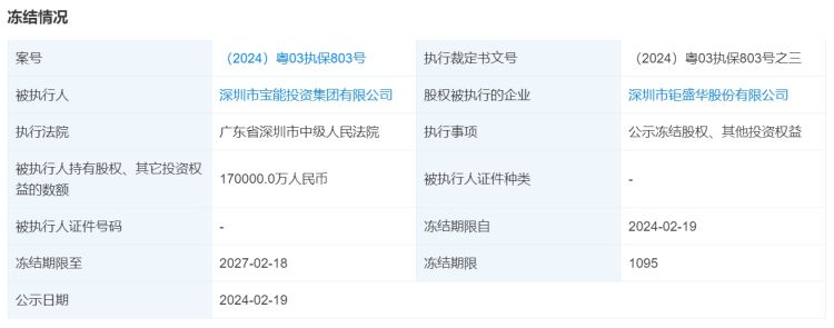 據天眼查網站,近日,深圳市寶能投資集團有限公司新增一則股權凍結信息。股權被執行的企業為深圳市鉅盛華股份有限公司,凍結股權數額為17億元,凍結期限自2024年2月19日至2027年2月18日,執行法院為廣東省深圳市中級人民法院。