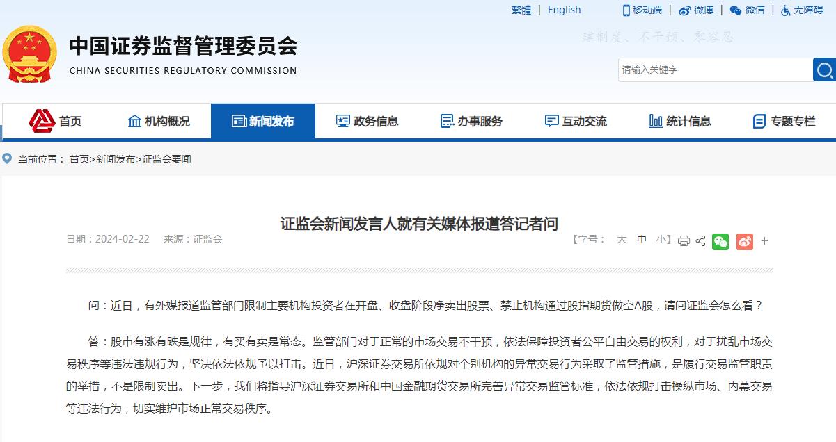 證監會新聞發言人表示,股市有漲有跌是規律,有買有賣是常態。監管部門對於正常的市場交易不干預,依法保障投資者公平自由交易的權利,對於擾亂市場交易秩序等違法違規行為,堅決依法依規予以打擊。近日,滬深證券交易所依規對個別機構的異常交易行為採取了監管措施,是履行交易監管職責的舉措,不是限制賣出。下一步,我們將指導滬深證券交易所和中國金融期貨交易所完善異常交易監管標準,依法依規打擊操縱市場、內幕交易等違法行為,切實維護市場正常交易秩序。