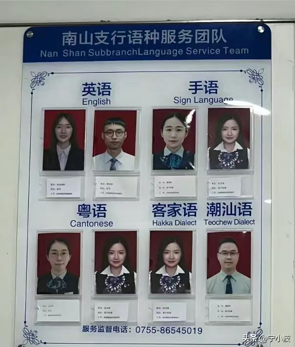 近日,有網友曬出在深圳某銀行拍到的多語言服務團隊公示牌:一個小小團隊可以提供英語、手語、粵語、客家語、潮汕語等多語言服務顧客。一石激起千層浪,人們紛紛點讃:這不僅說明銀行的專業與優秀,更折射出深圳範兒夠開放好包容。詳情>>>