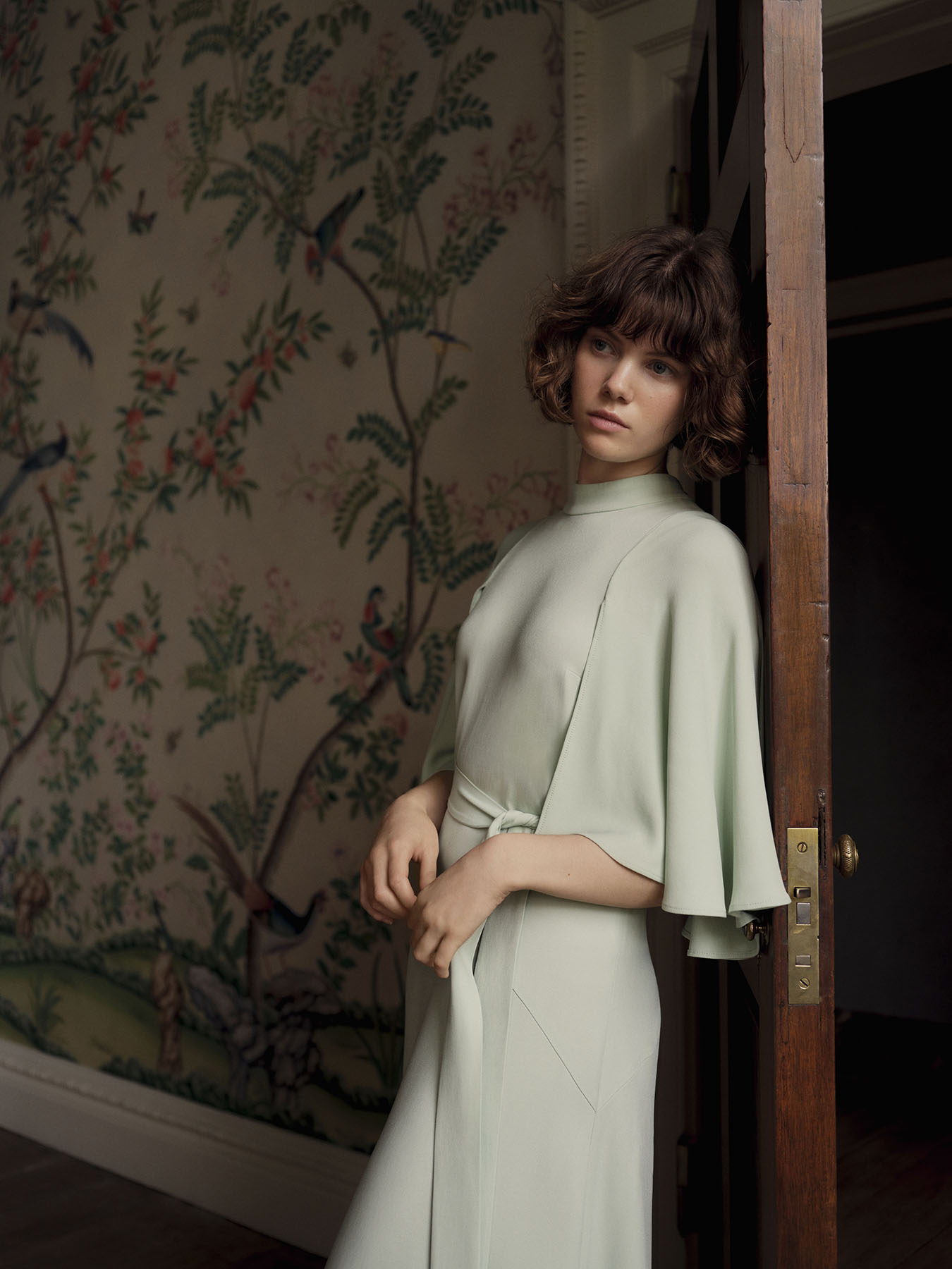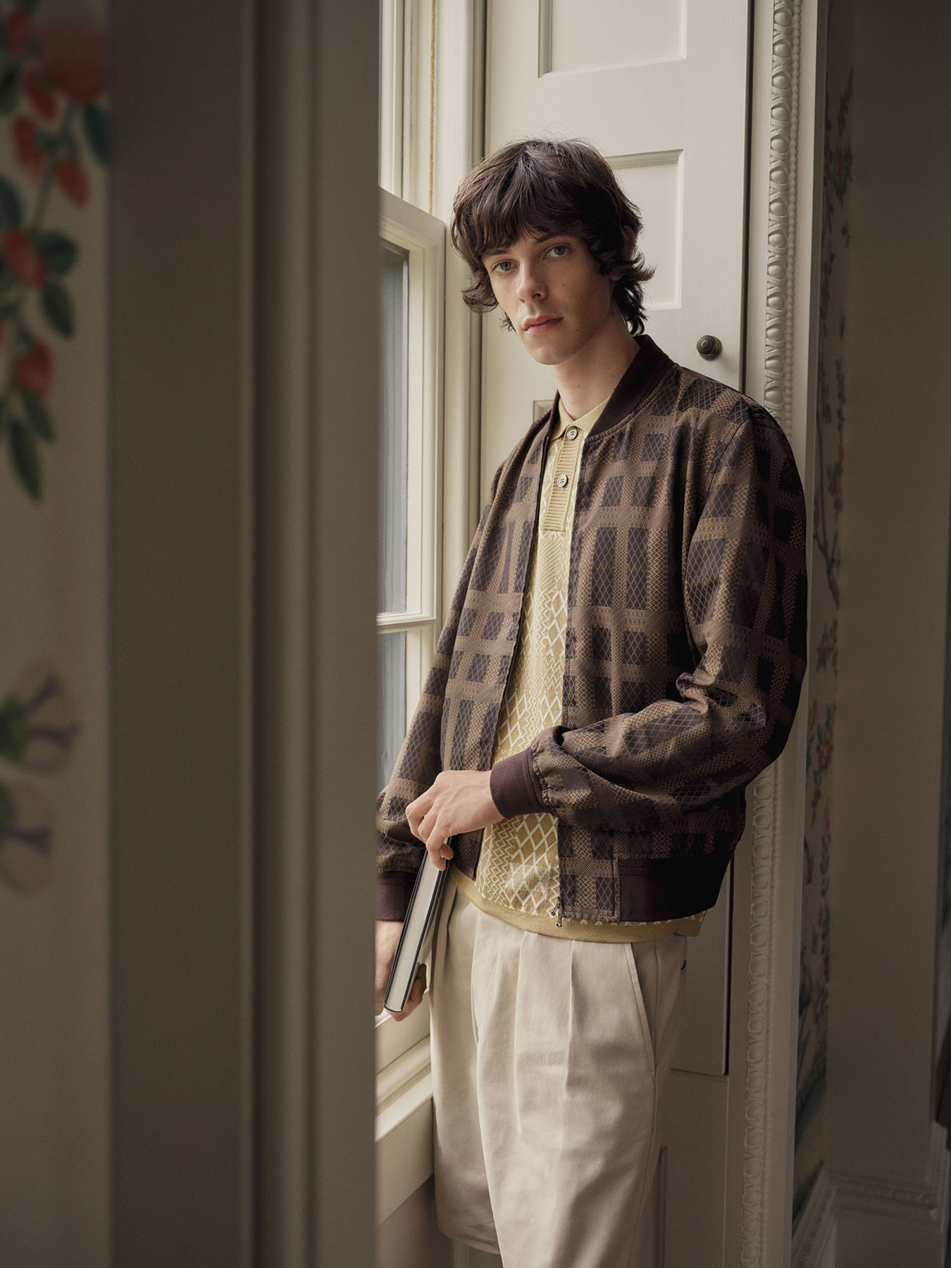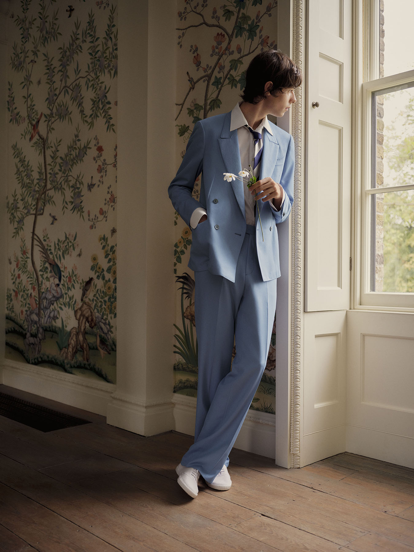為迎合春季的氛圍,系列的色彩調色盤靈感來自藝術家David Hockney的作品,運用淺淡、柔和的色調,凸顯新穎現代感。重點男裝包括一套富有現代風格、清爽的羊毛雙排扣藍色西裝,以及橄欖色調的休閒夾克外套。而女裝系列則以披肩袖、柔軟的薄荷綠茶洋裝裙和米色的絲綢混紡束腰軍裝風夾克外套作為本季亮點。