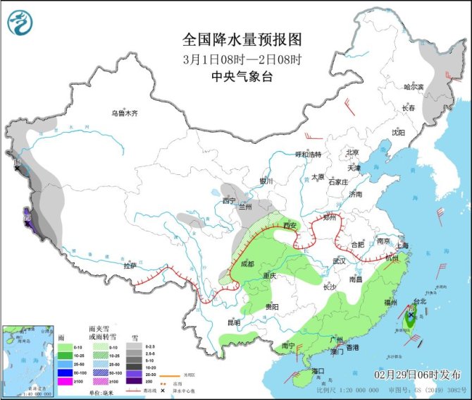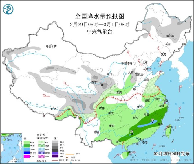 中央氣象台網站2月29日消息,過去一天,全國雨雪逐漸發展增強,北方大部以降雪為主,集中在西北地區東部、內蒙古、山西、山東和東北三省等地;南方地區雨水範圍明顯擴大,江蘇、上海、浙江、安徽南部、江西中北部、湖南中南部、廣西北部等地部分地區出現中到大雨,今天凌晨起,蘇皖北部出現雨轉雪,江蘇連雲港、宿遷、徐州等地雪花紛飛,並伴隨低溫和大風天氣,體感十分寒冷。