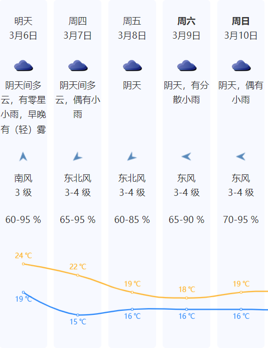 5日夜間-6日清晨:大致多雲,天氣暖濕,有輕霧,沿海地區有能見度1公里以下的大霧,偏南陣風6-7級,伴有回南天;