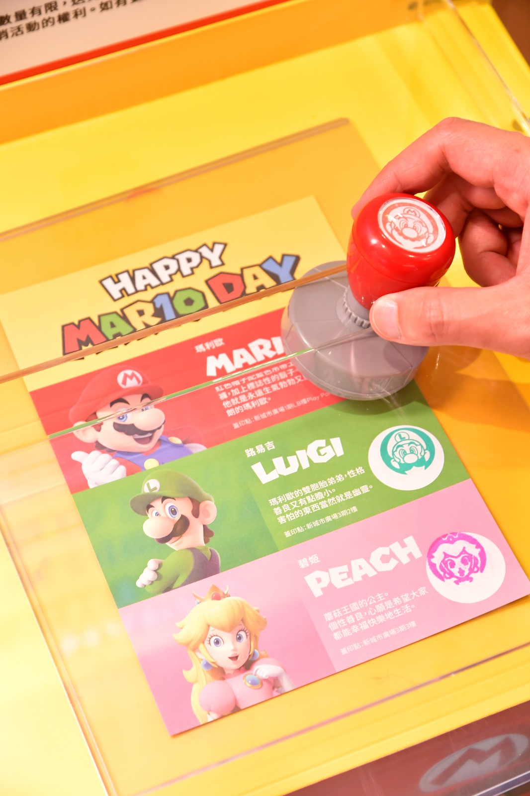 3月15日及16日將會在現場舉辦瑪利歐見面會,粉絲可零距離與瑪利歐互動合照。兩日的下午3時、3時45分及4時30分各三節。 除了兩個活動區域外,在新城市廣場的1期LB樓Play Park、3期2樓、3期3樓設有三個「瑪利歐系列角色蓋印點」,可與好友一起到三個蓋印點集齊印章,換取限量「HAPPY MAR10 DAY鑰匙扣」。(記者:Katherine)