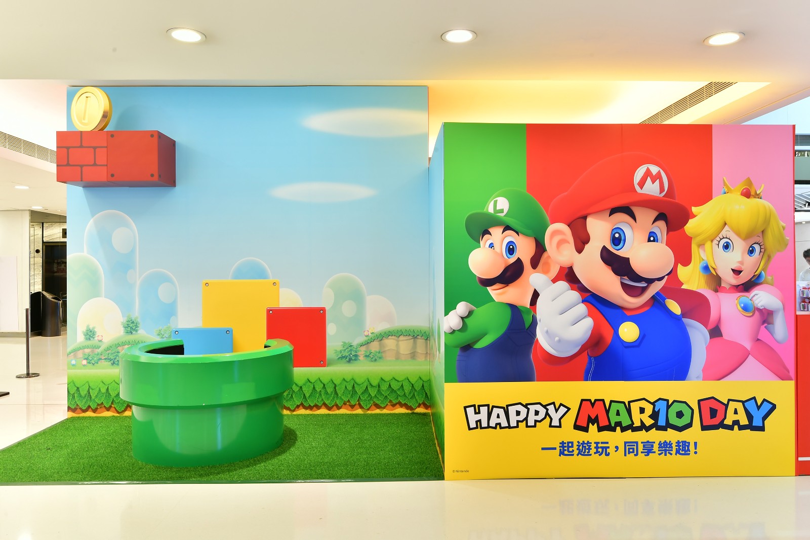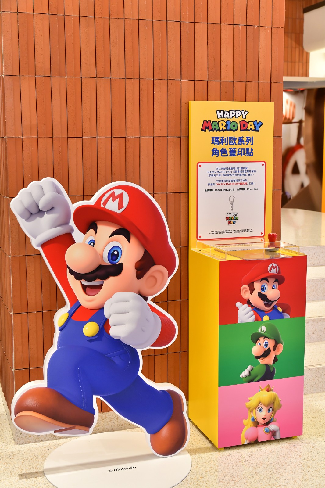位於廣場1期1樓東翼的主會場設有MAR10 DAY主題攝影區,帶來三大打卡位,包括MAR10 DAY特色主題牆、「瑪利歐」水管場景及特色燈箱等,猶如走進瑪利歐的小世界,粉絲可在此與好友拍照打卡。現場完成「Nintendo Account簽到」任務,即可獲贈「瑪利歐造型 小物收納吊飾」。