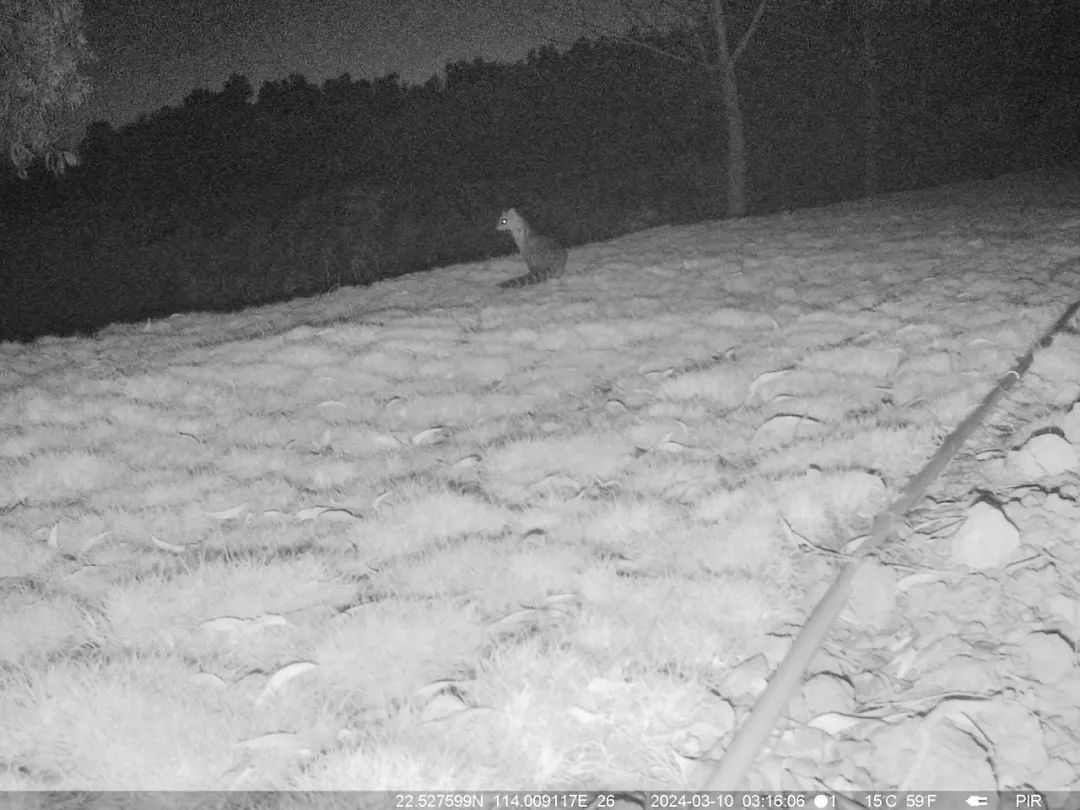 此外,在2023年,廣東梧桐山國家森林公園管理處布置的紅外相機,也記錄到小靈貓踏着夜色尋覓食物的珍貴視頻。
