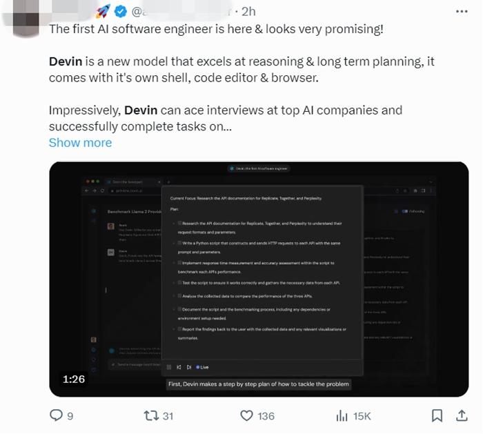 「第一位AI工程師看起來很有希望,令人印象深刻的是,Devin可以在頂級AI公司的面試中脫穎而出,並且成功地完成了任務。」有人工智能專家在社交平台分享觀點。多個Devin編程的視頻也在網絡流傳。