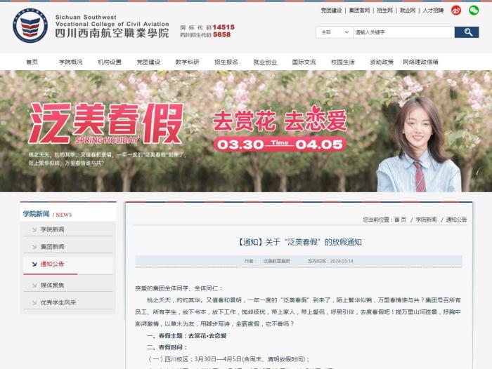 四川西南航空職業學院3月14日發布《關於「泛美春假」的放假通知》,該通知安排全校師生3月30日至4月5日放7天春假(含清明放假時間),並號召所有員工、所有學生,放下書本,放下工作,帶上家人,帶上愛侶,呼朋引伴,去度春假。