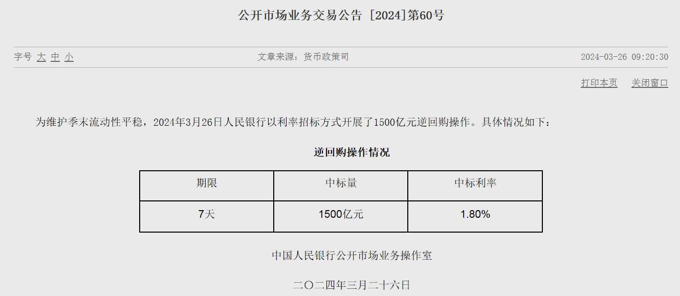 央行網站消息,為維護季末流動性平穩,3月26日人民銀行開展1500億元7天期逆回購操作,利率與此前持平。