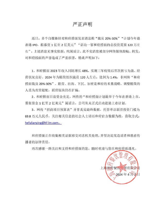 聲明稱,近日,多個自媒體針對和府撈麵發表消息稱「裁員20%-30%」「計劃今年赴香港IPO,擬募資1億至2億美元」「啟動一家和府撈麵的總投資需要120萬左右」,上述消息無事實依據,純屬謠言。