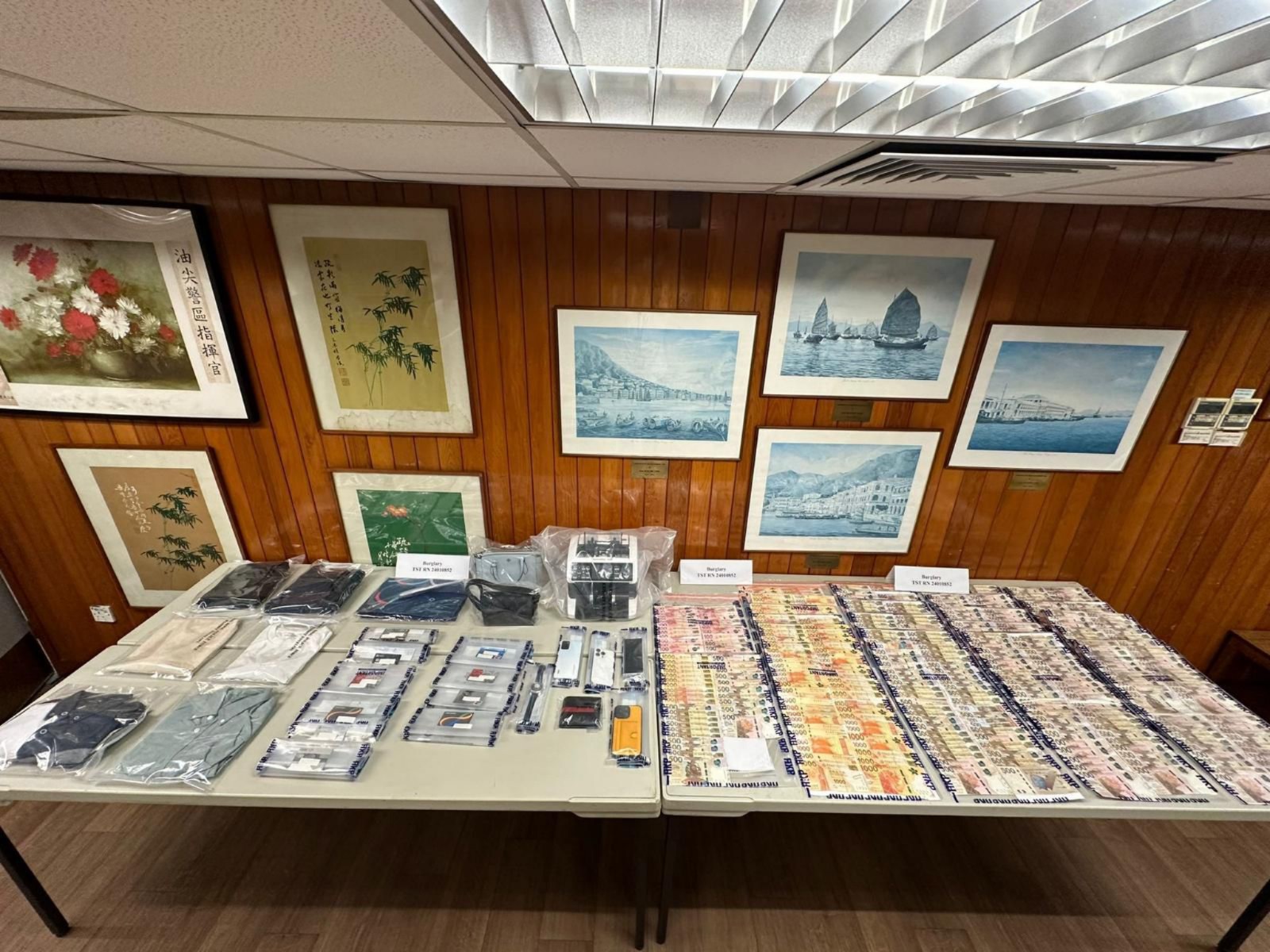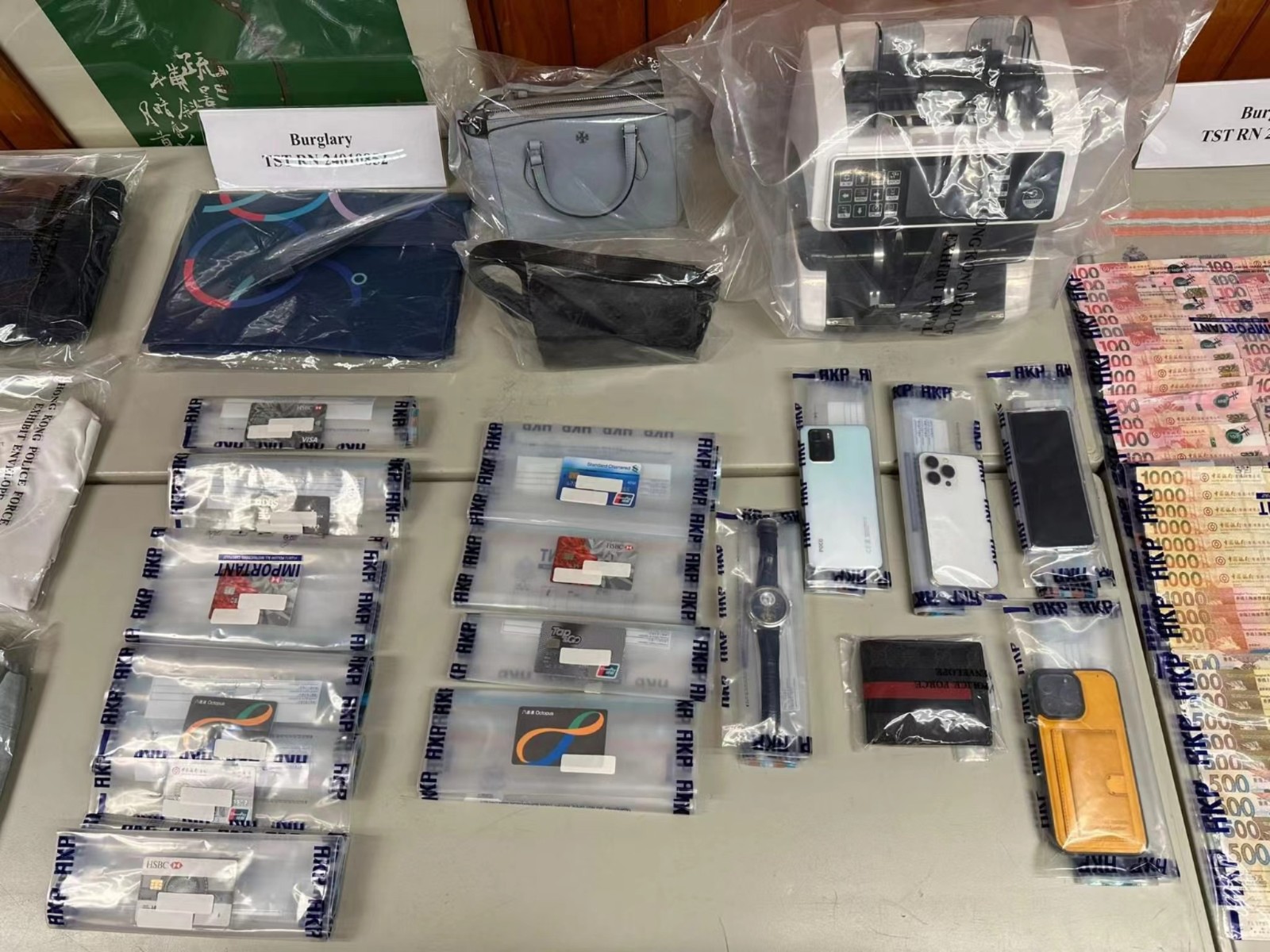 另一方面,警方今日下午在上水一間藥房,以處理贓物罪拘捕一名懷疑協助收取被盜手袋的52歲女子,她持雙程證來港,報稱藥房東主。探員在藥房內檢取數錢機及載有被盜手袋的帆布袋。