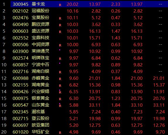 其中,黃金概念股再度活躍,19股漲超5%,曼卡龍等11股漲停。