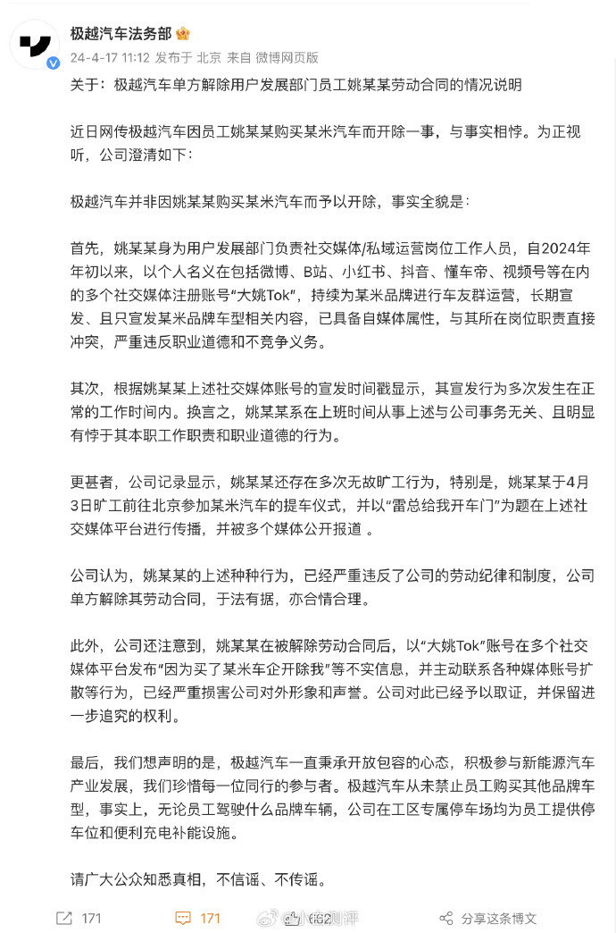 極越方面亦發布聲明,稱該員工在職期間無故請假,並通過編造虛假理由不到崗,存在嚴重曠工行為,違反了公司的勞動紀律。