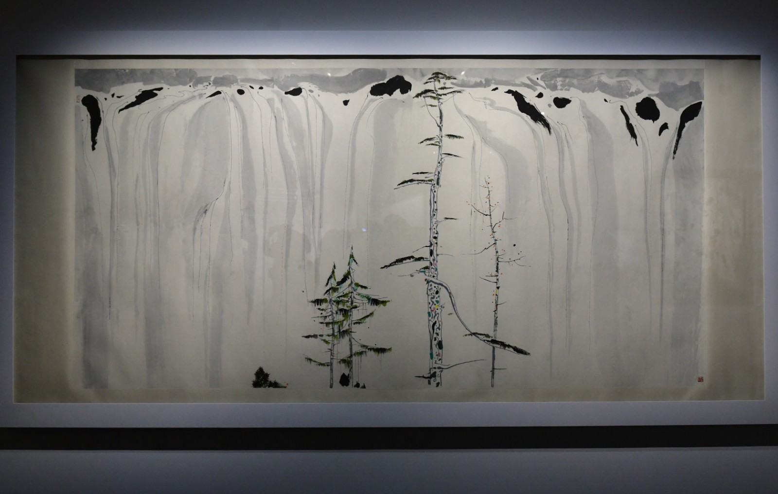 吳冠中的畫作蘊含西方平面設計及中國傳統美學,如幾何線條、留白,善於選取景物中的美學元素,解構為抽象的線條造型。焦點展品、吳冠中捐給藝術館的首幅作品《瀑布》描繪了九寨溝諾日朗的瀑布,寬闊而垂直下跌,遠看寧靜安詳,鍾館長介紹:「畫家以黑色、灰色色塊繪於上方表現瀑布緩緩流下,寥寥細線繪出幾株乾瘦的樹,令人歸於平靜。」